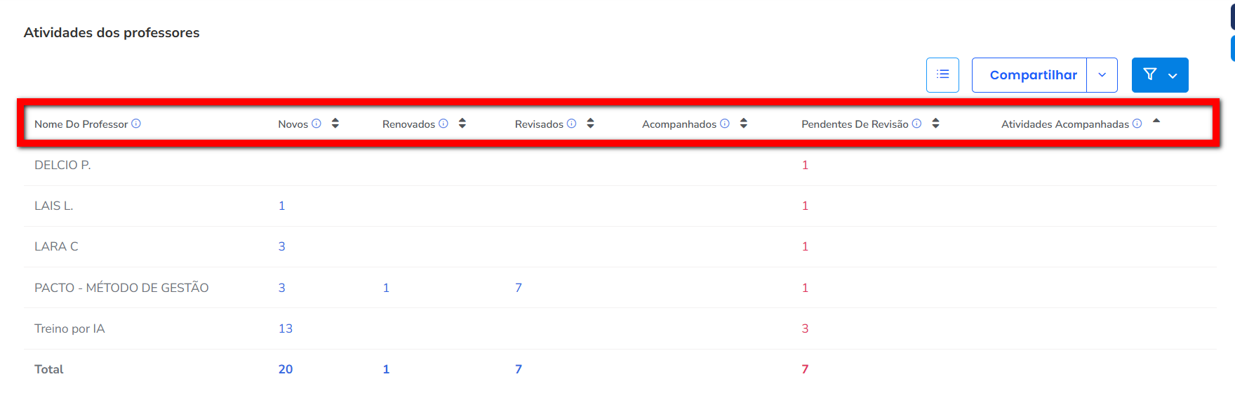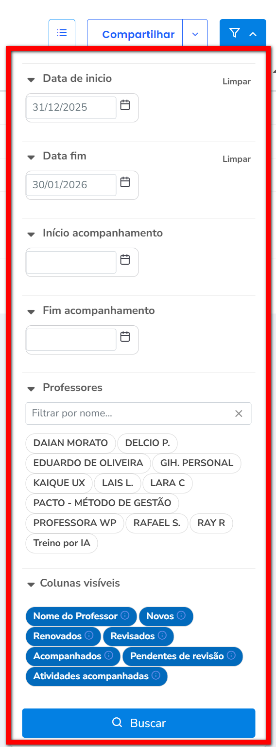 O relatório Atividades dos Professores apresenta informações detalhadas sobre o trabalho realizado pelos professores em relação aos treinos dos alunos. Ele exibe dados como treinos criados, renovados e revisados, além da quantidade de alunos acompanhados dentro do período selecionado.
