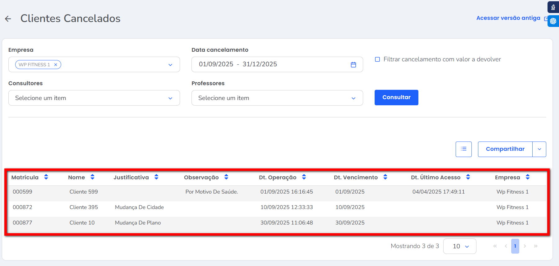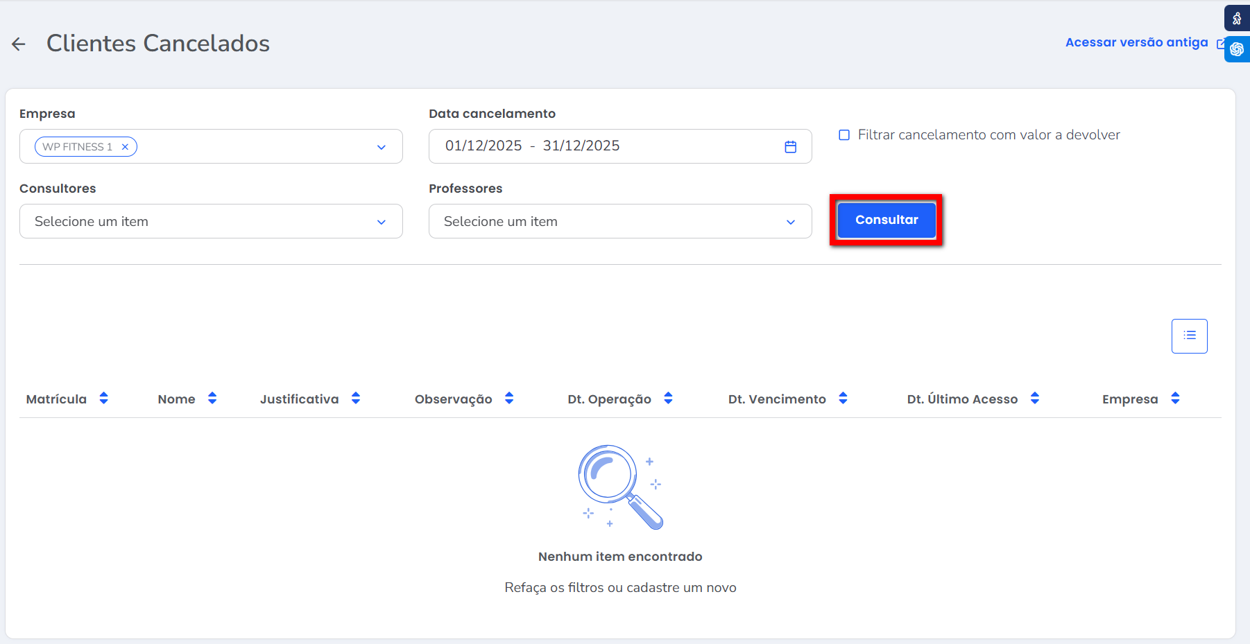 - Empresa: selecione a unidade que deseja visualizar os alunos cancelados;