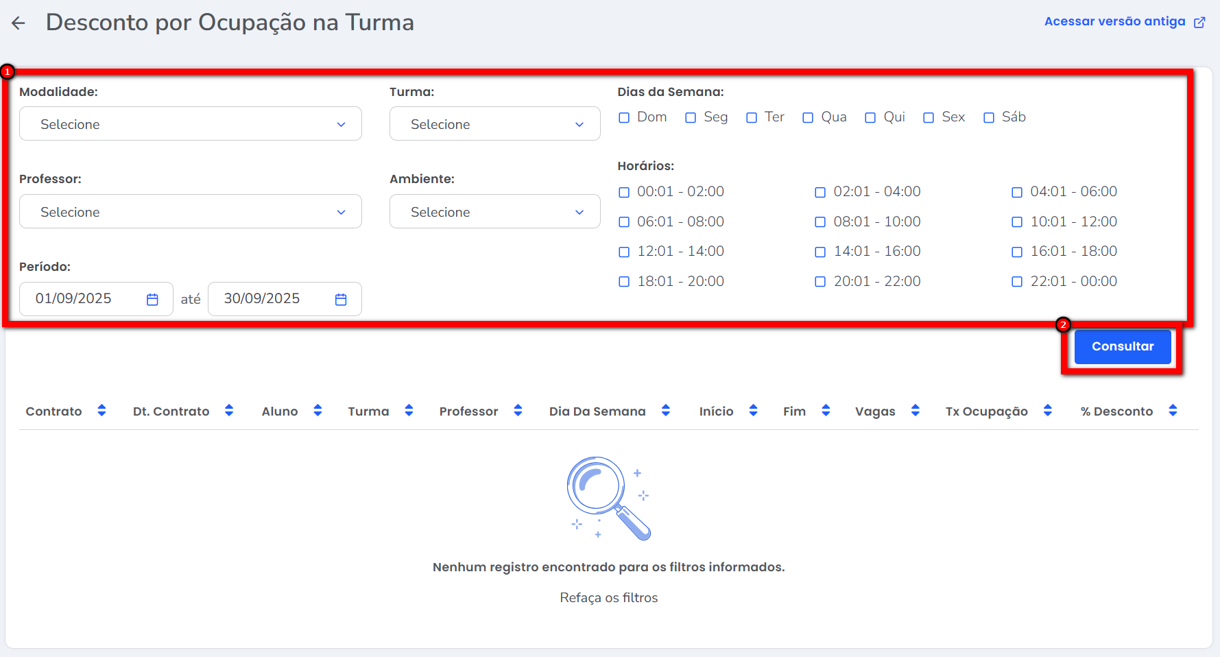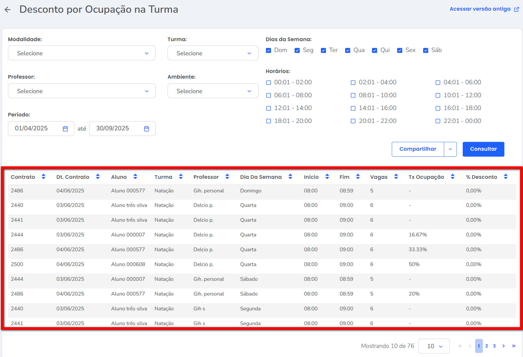 - % Desconto: apresenta em porcentagem o desconto pela ocupação na turma.
