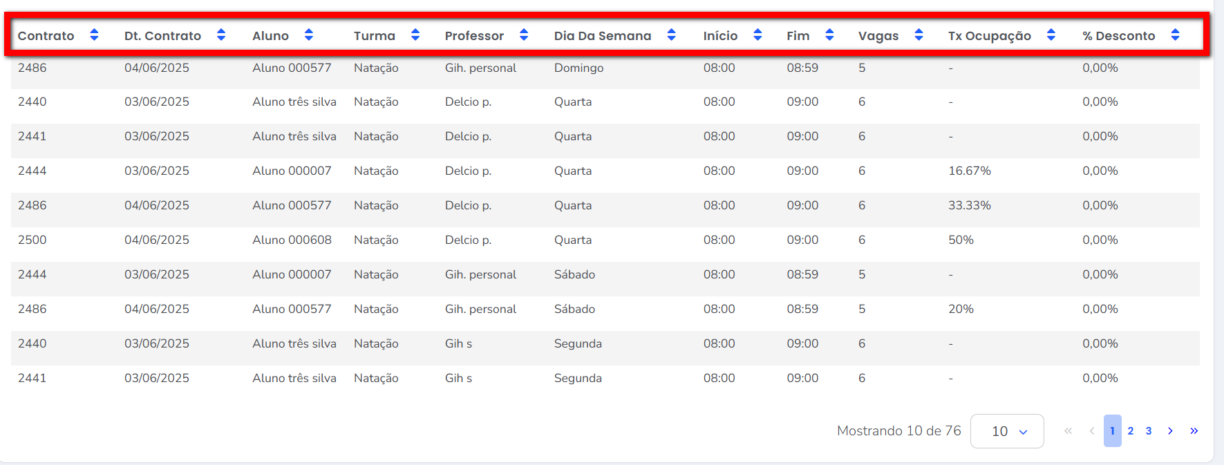 2. Caso deseje ordenar a listagem, é possível clicando sobre a opção apresentada de Contrato, Data Contrato, Aluno, Turma, Professor, Dias da Semana, horário de Início e Fim, Vagas, Taxa de Ocupação ou Porcentagem de Desconto.