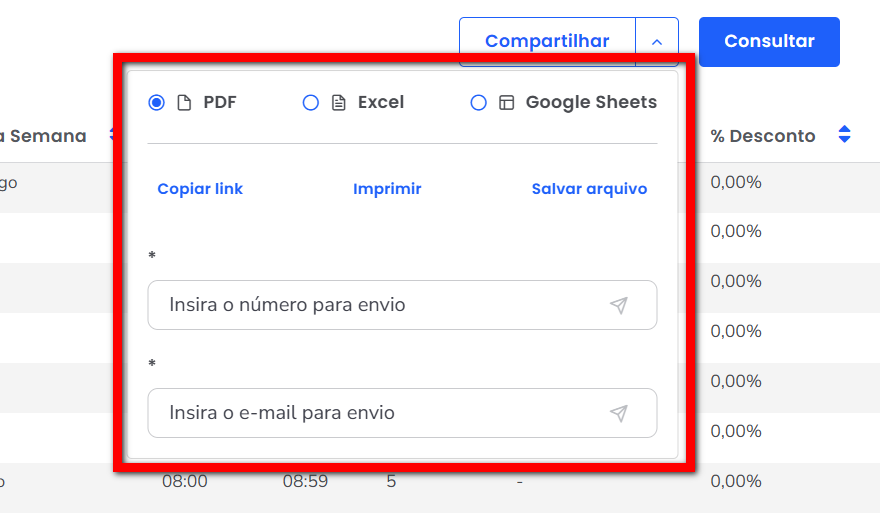 1. Consegue exportar a listagem para PDF, Excel ou Google Sheets, clicando em “Compartilhar“;