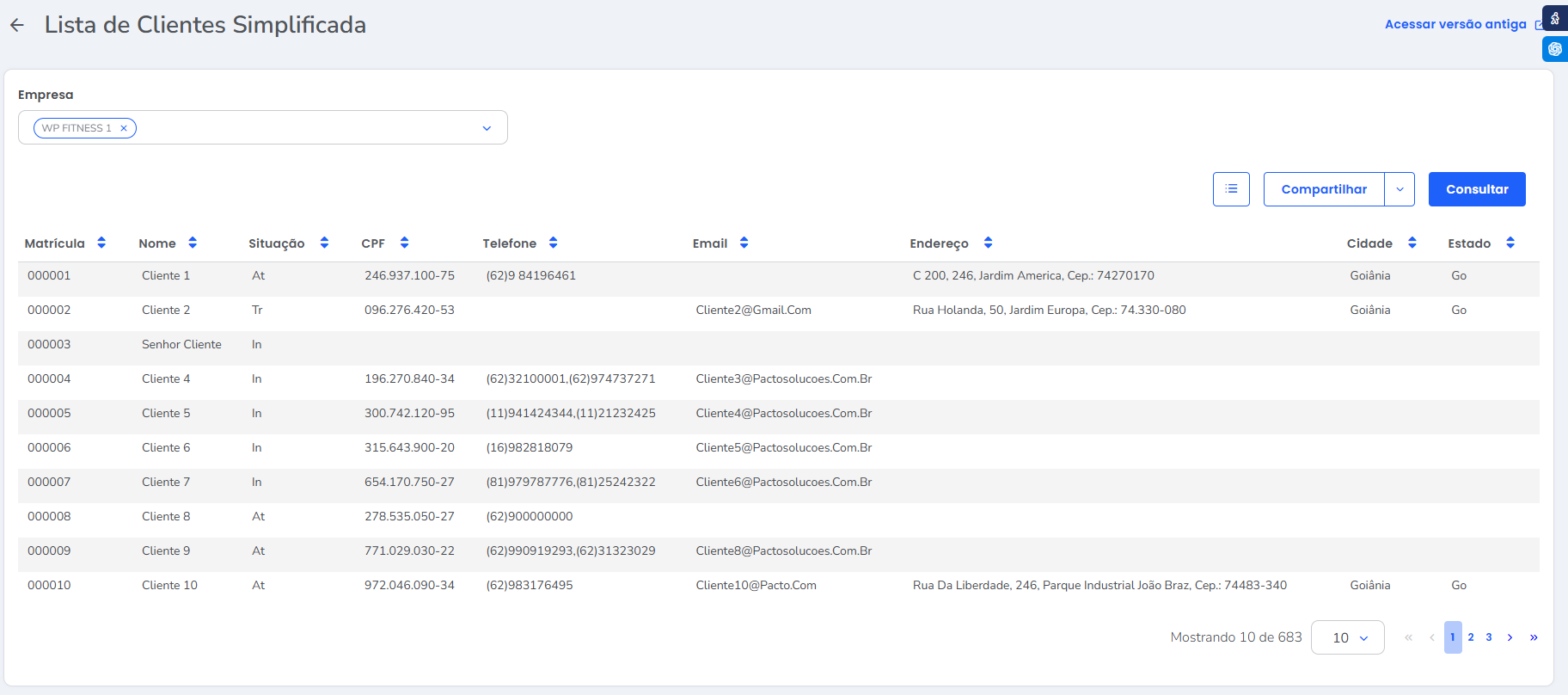 2. Será exibida a tela mostrando a lista de clientes, sua situação atual e os respectivos dados. Caso necessário, você pode alterar a empresa e clicar em “Consultar” para visualizar a lista de alunos da outra unidade;