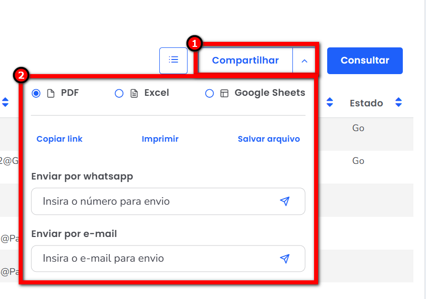 3. Ao clicar em Compartilhar, você pode baixar a listagem em PDF, Excel ou Google Sheets, além de enviá-la por WhatsApp ou e-mail.