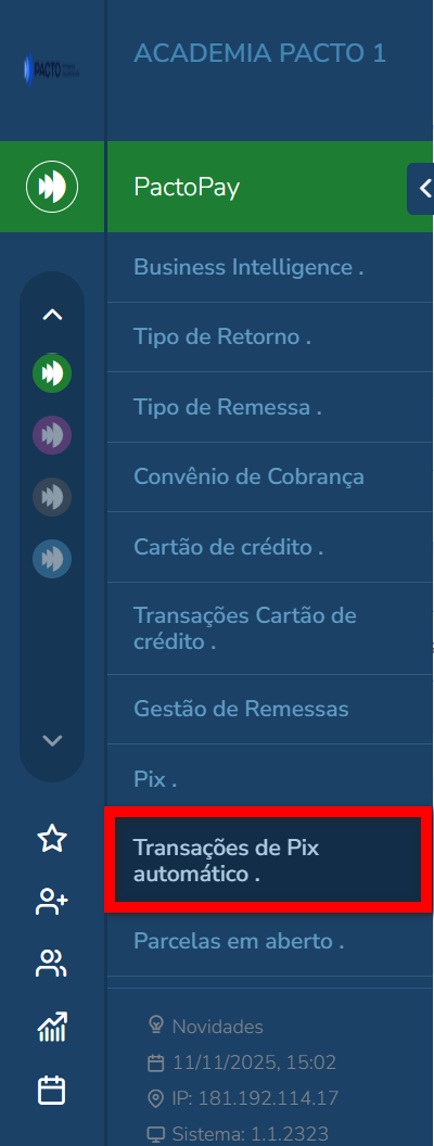 1. No menu do módulo PactoPay, localize e clique em “Transações de Pix automático”;