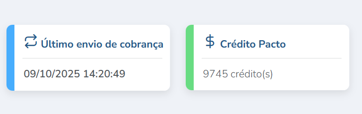 2.1. Na primeira parte da tela contém as informações de data de último envio de cobrança e a quantidade de créditos já consumidos ou a quantidade de créditos restantes (dependendo do contratado com a Pacto);