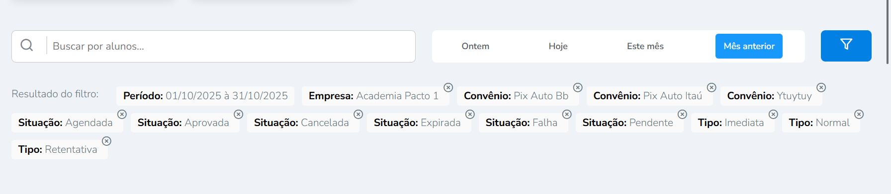 2.2. Na segunda parte da tela temos os filtros que estão sendo aplicados para apresentar os dados. Nestes filtros, é possível buscar pelo nome do aluno, período, empresas (caso seu banco de dados contenha mais de uma empresa cadastrada), convênio de cobrança e situação;