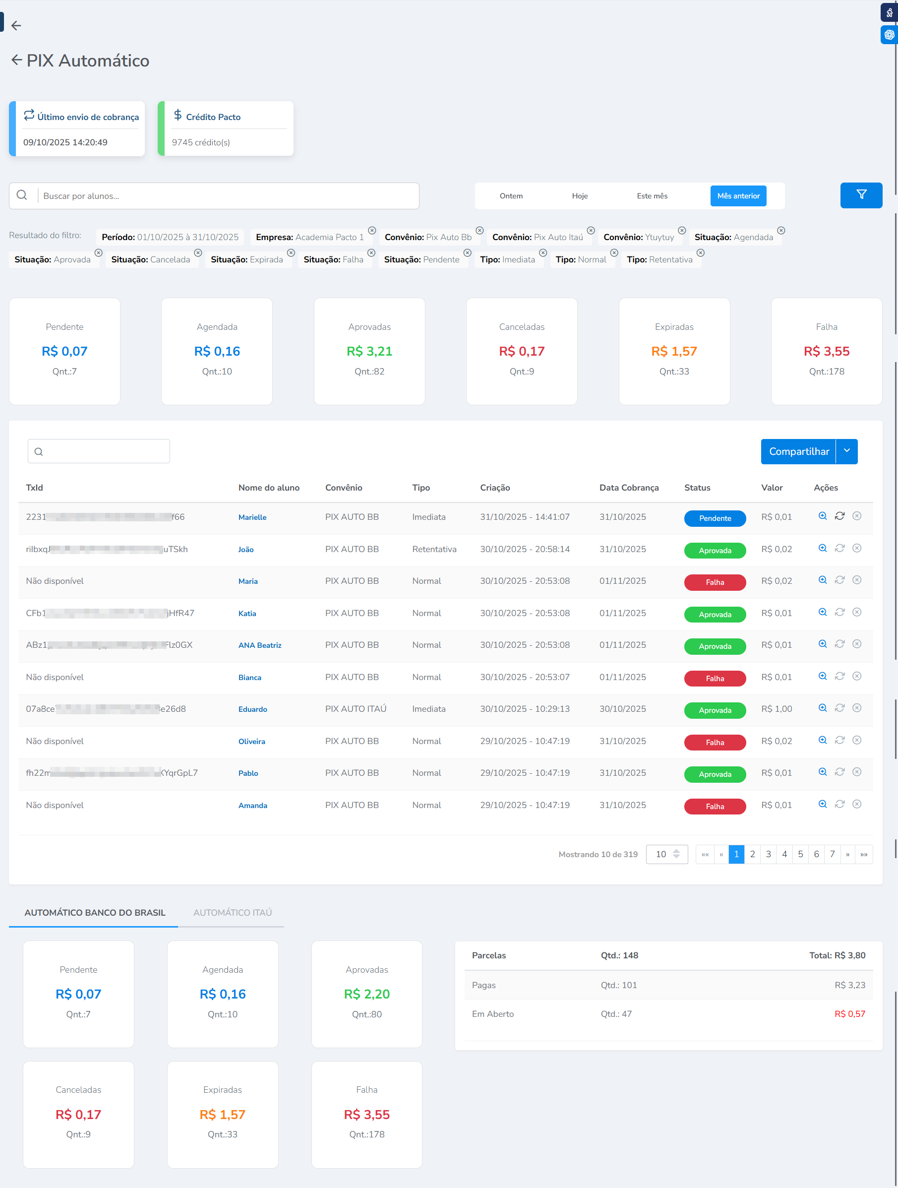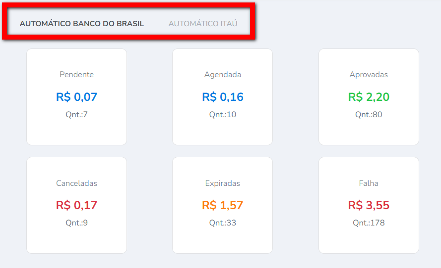 2.5. Ao final da tela, no lado esquerdo, são exibidos os indicadores por banco integrado ao Pix Automático. Isso significa que, se houver mais de um convênio de Pix automático configurado, o sistema mostrará os totalizadores separadamente para cada banco, facilitando o acompanhamento individual de cada integração;