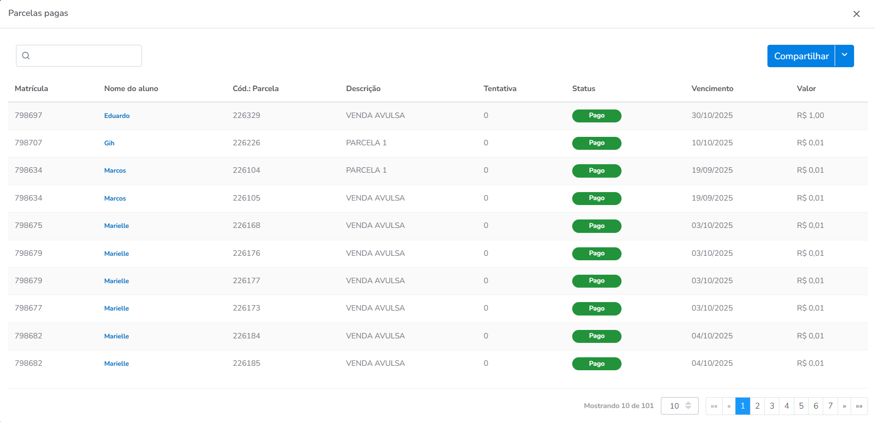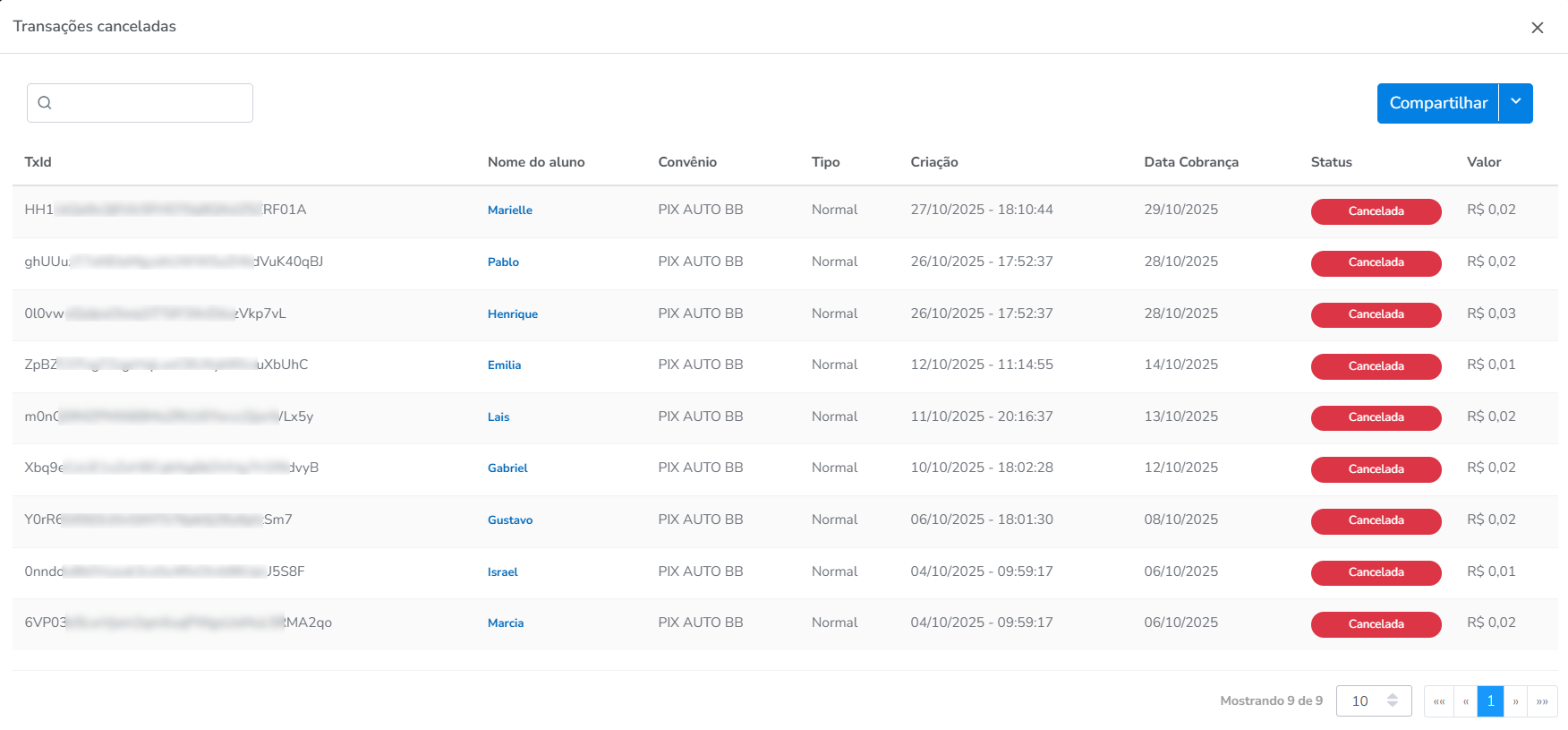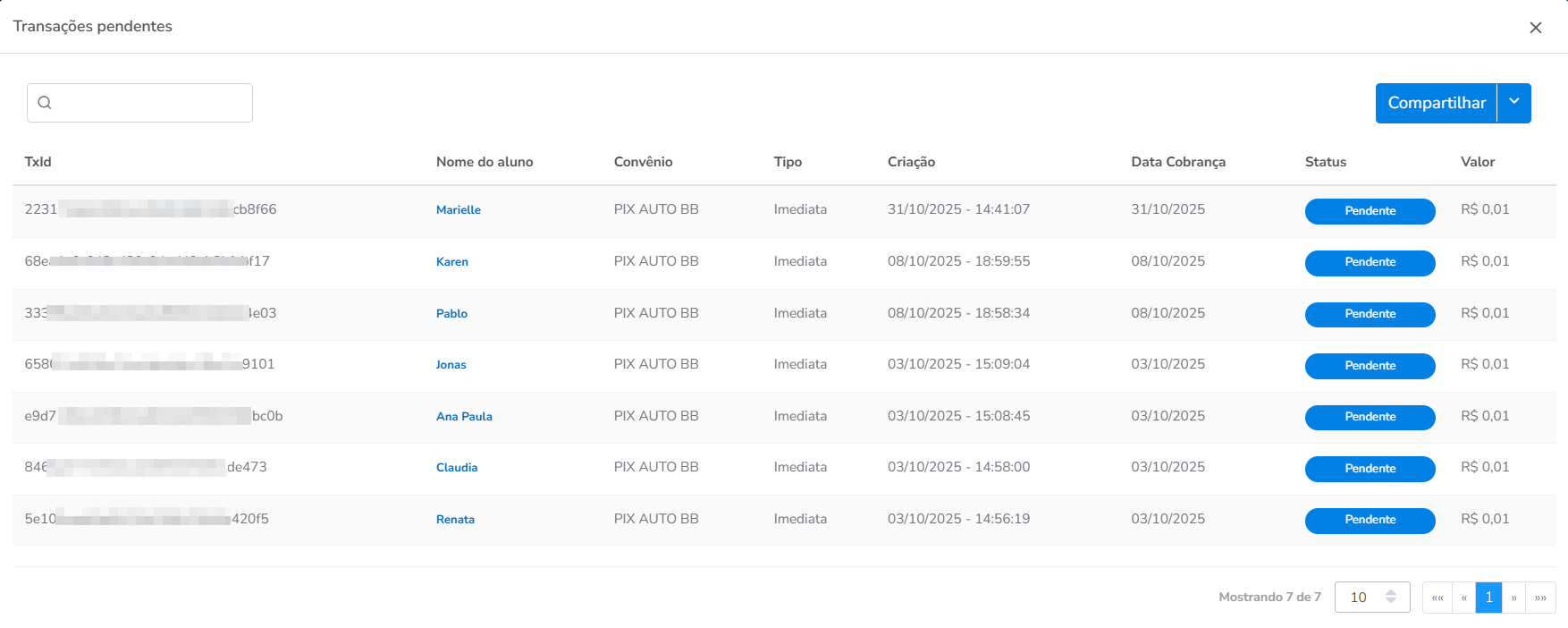 Observação: o “ TxId” funciona como um identificador da transação, com ele é possível verificar se o aluno realizou o pagamento através do sistema ou não. Esse código é informado dentro do recibo fornecido pelo banco do aluno, caso os códigos não sejam iguais, significa que o pix foi feito diretamente entre as contas da empresa e do aluno.