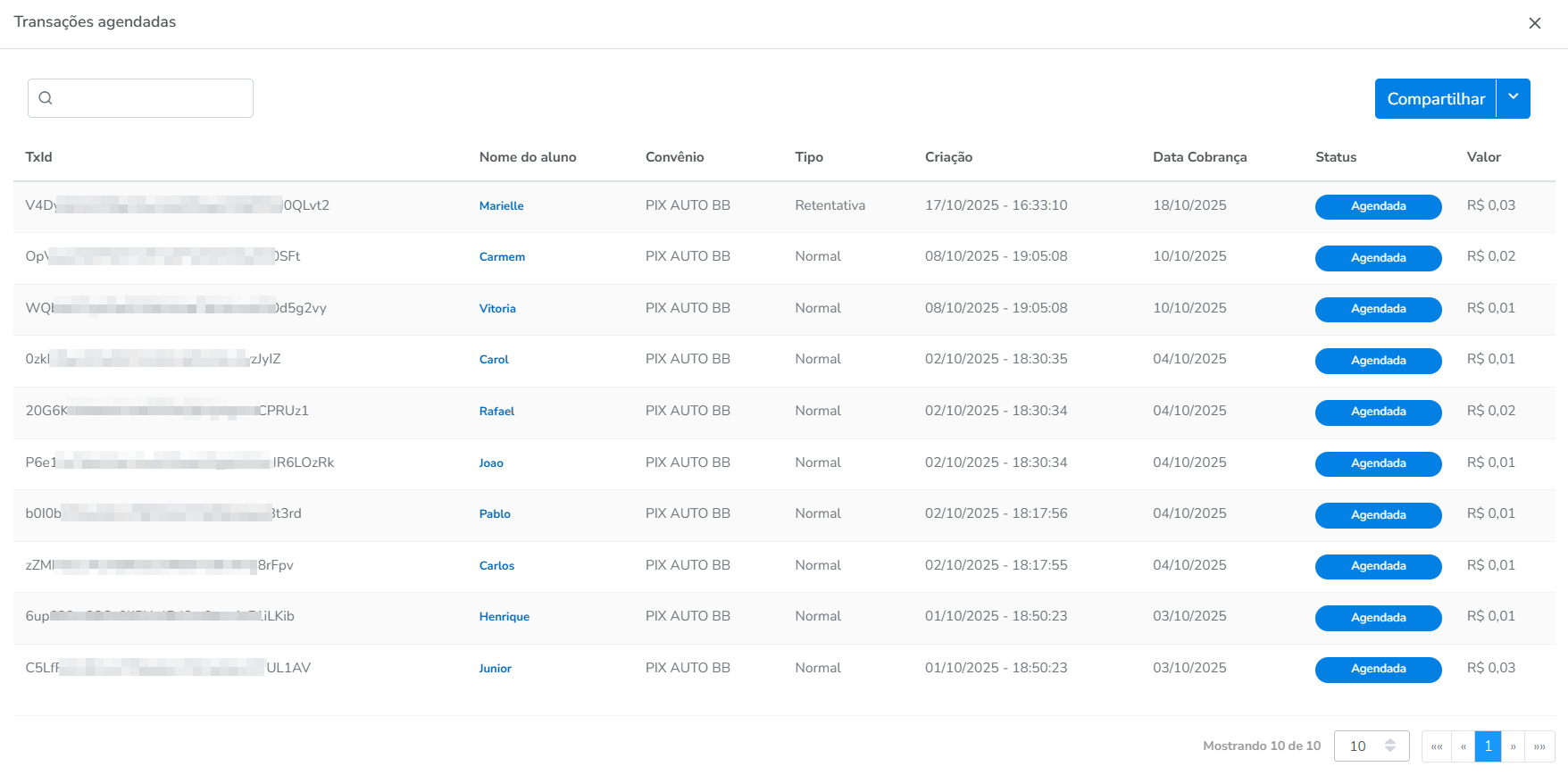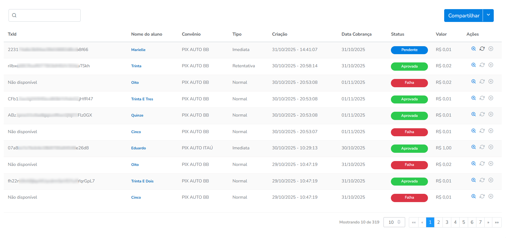 2.4. Logo abaixo dos indicadores, é exibida a listagem de transações, que apresenta uma visão completa de todas as cobranças realizadas pelo Pix Automático;