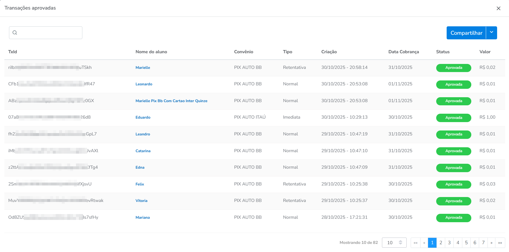 2.3.3. No indicador “Aprovadas” são apresentadas todas as transações de PIX automático que já foram debitadas na conta do aluno, ou seja, o pagamento foi efetivamente realizado;