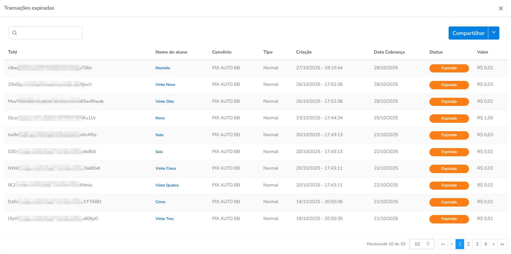 Por exemplo: a data de cobrança é hoje e, por algum motivo, o valor não foi debitado da conta do aluno (por falta de saldo, limite ou outro motivo), ao encerrar o dia a cobrança muda automaticamente para “Expirado”.
