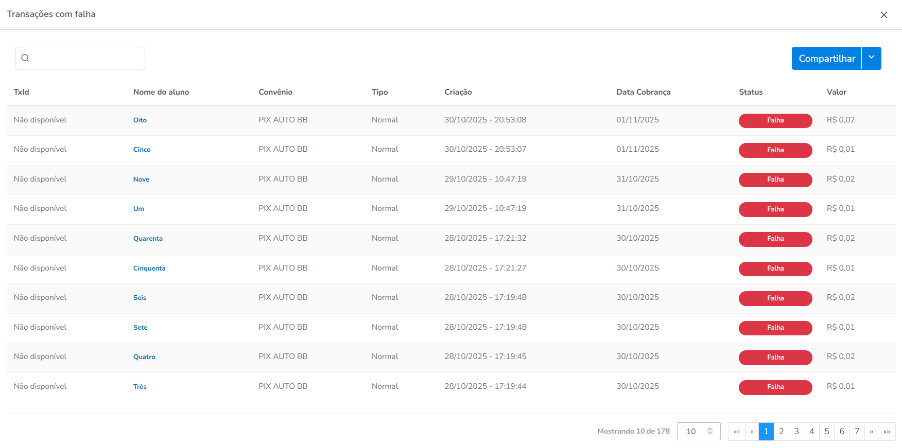 2.3.6. No indicador “Falha” são apresentadas as transações PIX automatico que tiveram algum erro na tentativa de cobrança.