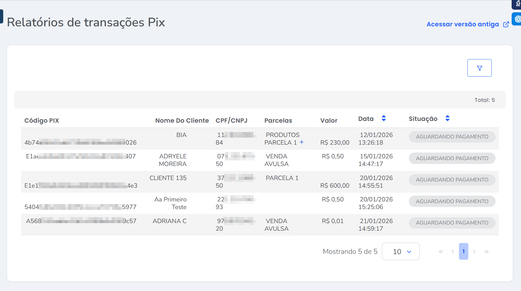 - Situação: apresenta o status da cobrança, podendo ser PAGO, EXPIRADA, AGUARDANDO PAGAMENTO ou CANCELADA.