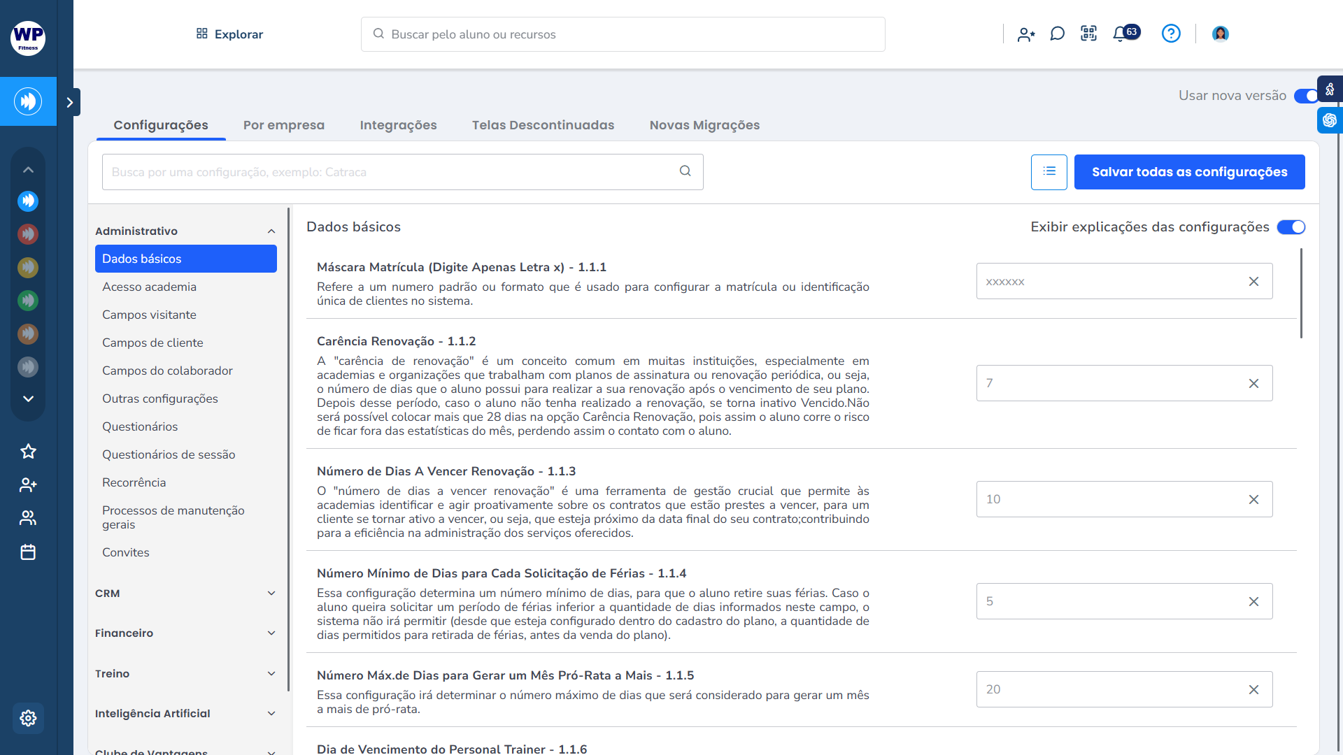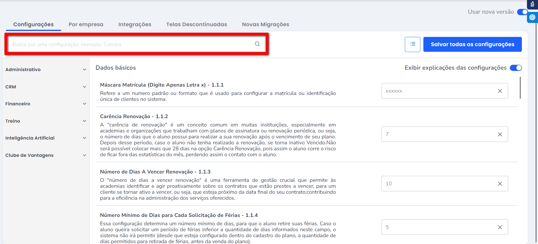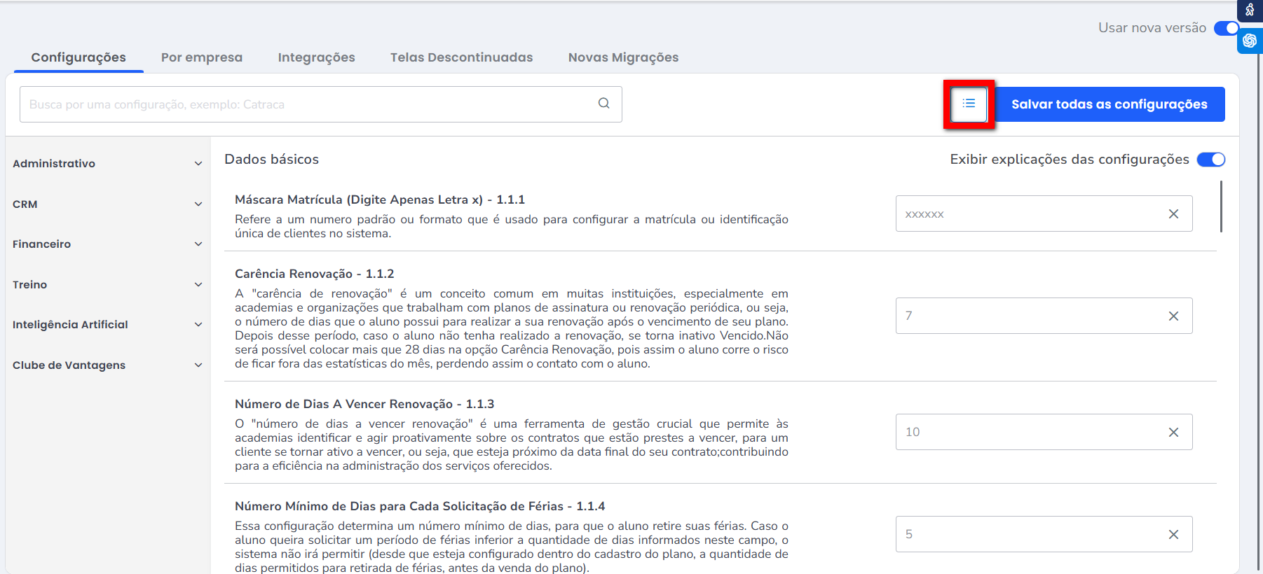 Observação: ao habilitar a opção “Exibir explicações das configurações”, o sistema passa a apresentar descrições detalhadas sobre o funcionamento de cada configuração.
