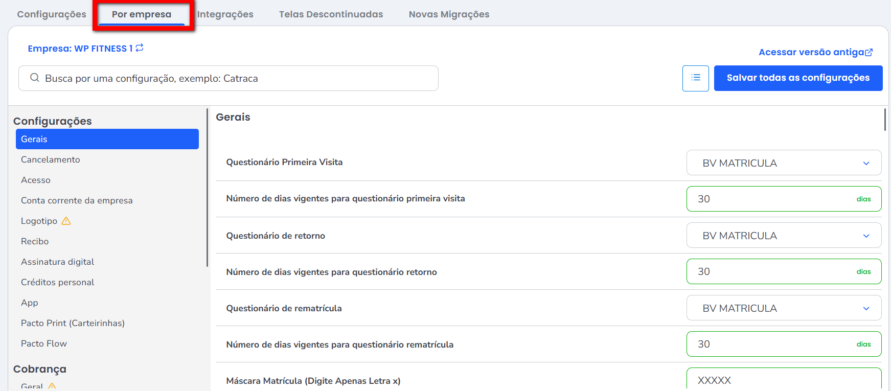 3. Clicando em “Por empresa” tem acesso à tela com todas as configurações disponíveis no sistema;